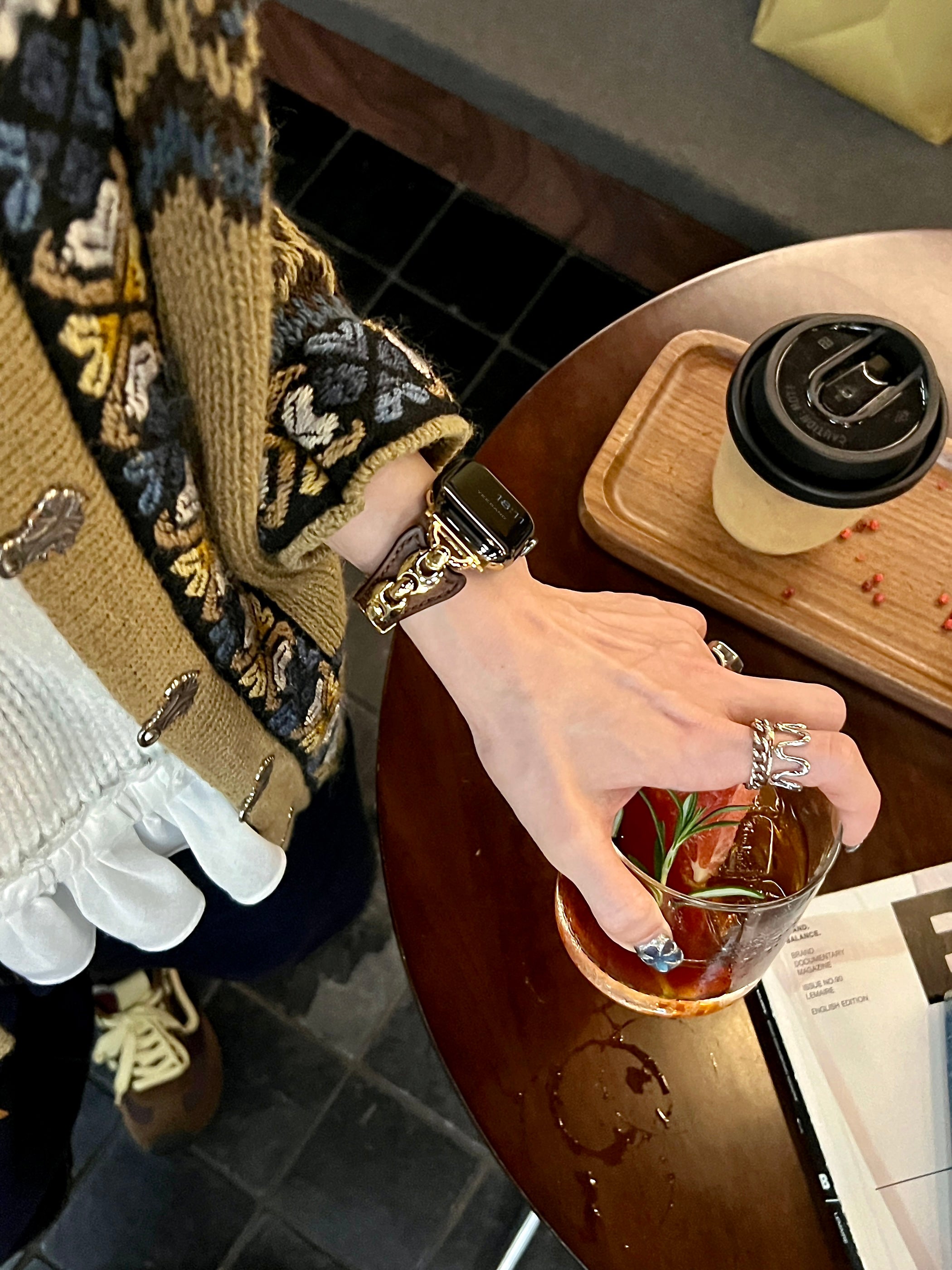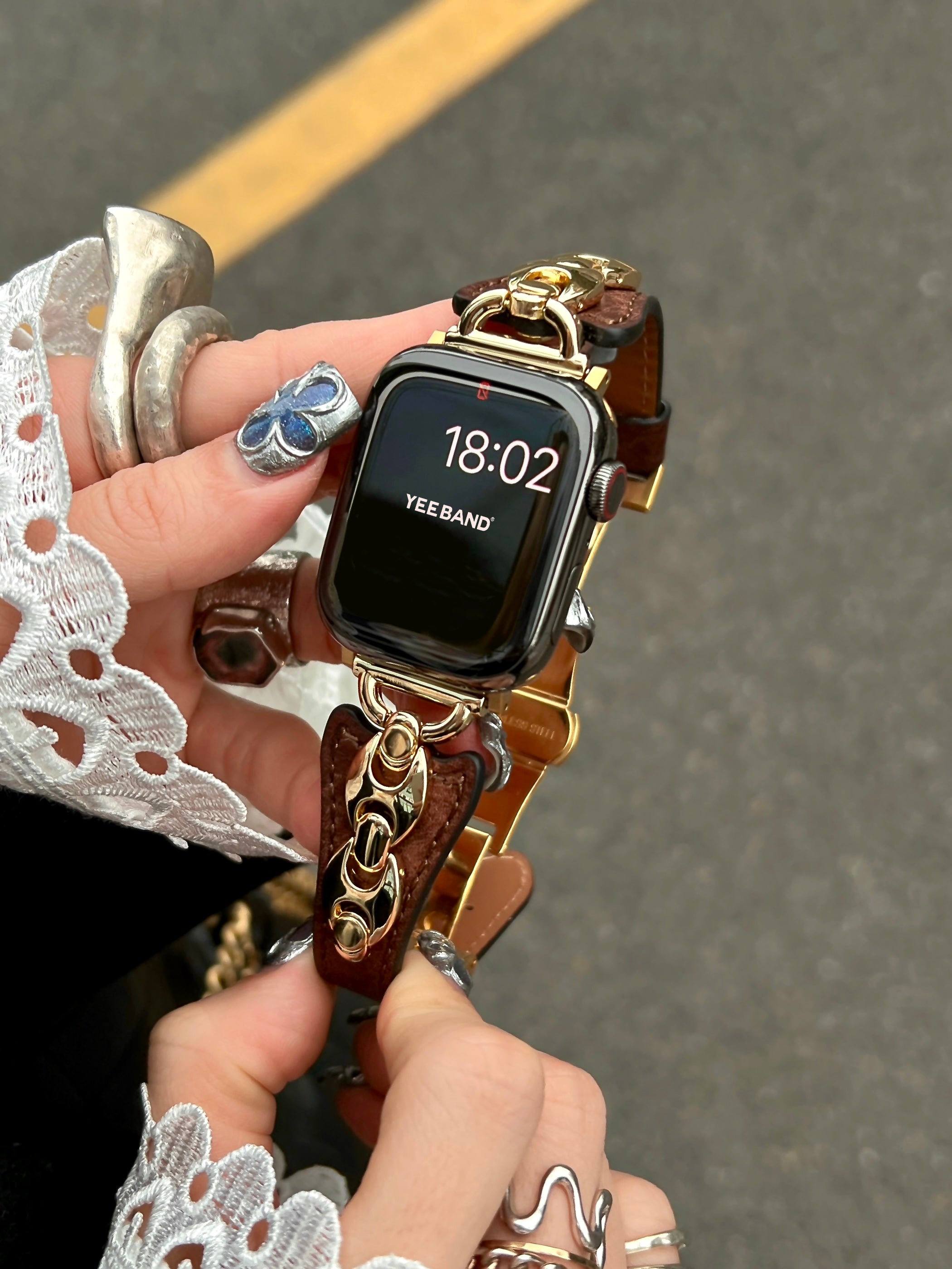 A strap that brings warmth and texture to your wrist — soft vintage leather meets polished metal coffee-bean accents. Minimal, chic, and just the right amount of charm.
