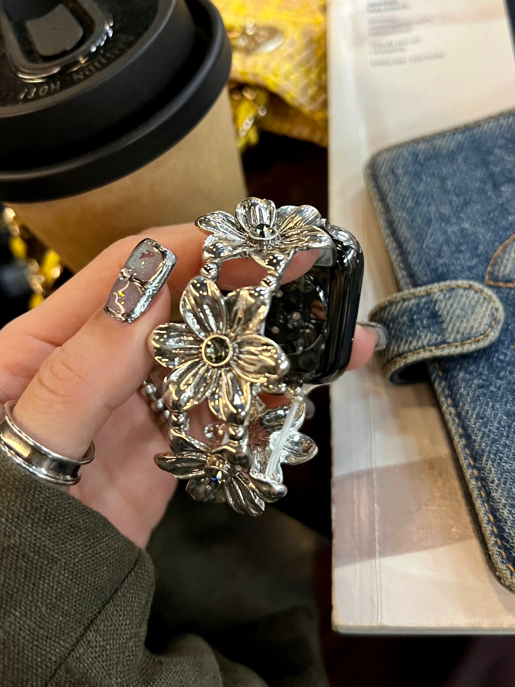Bold, sculptural silver-toned metal bracelet with an organic, floral-inspired design. Its polished finish and layered, three-dimensional details create an eye-catching statement that elevates any minimalist or retro outfit.