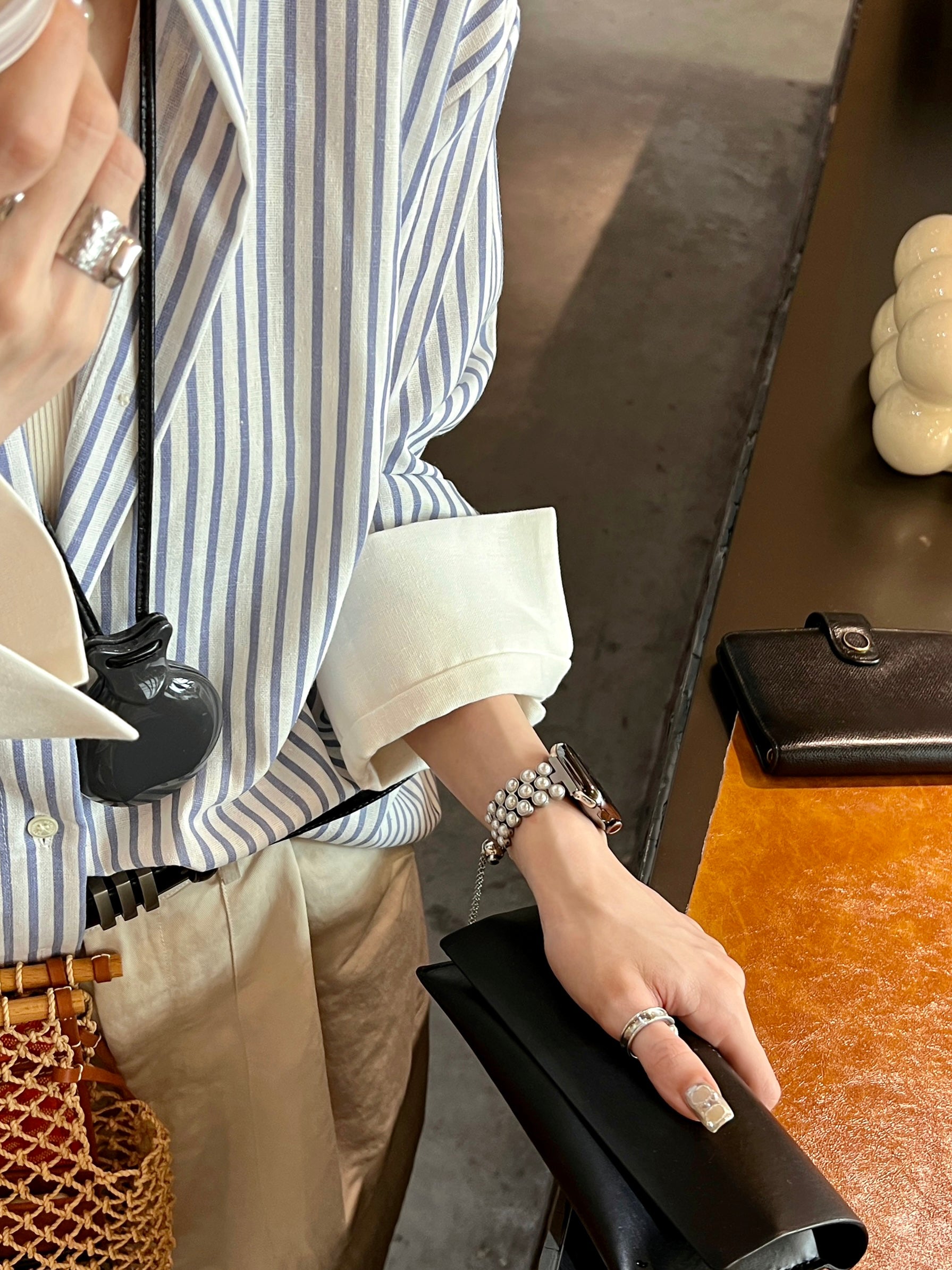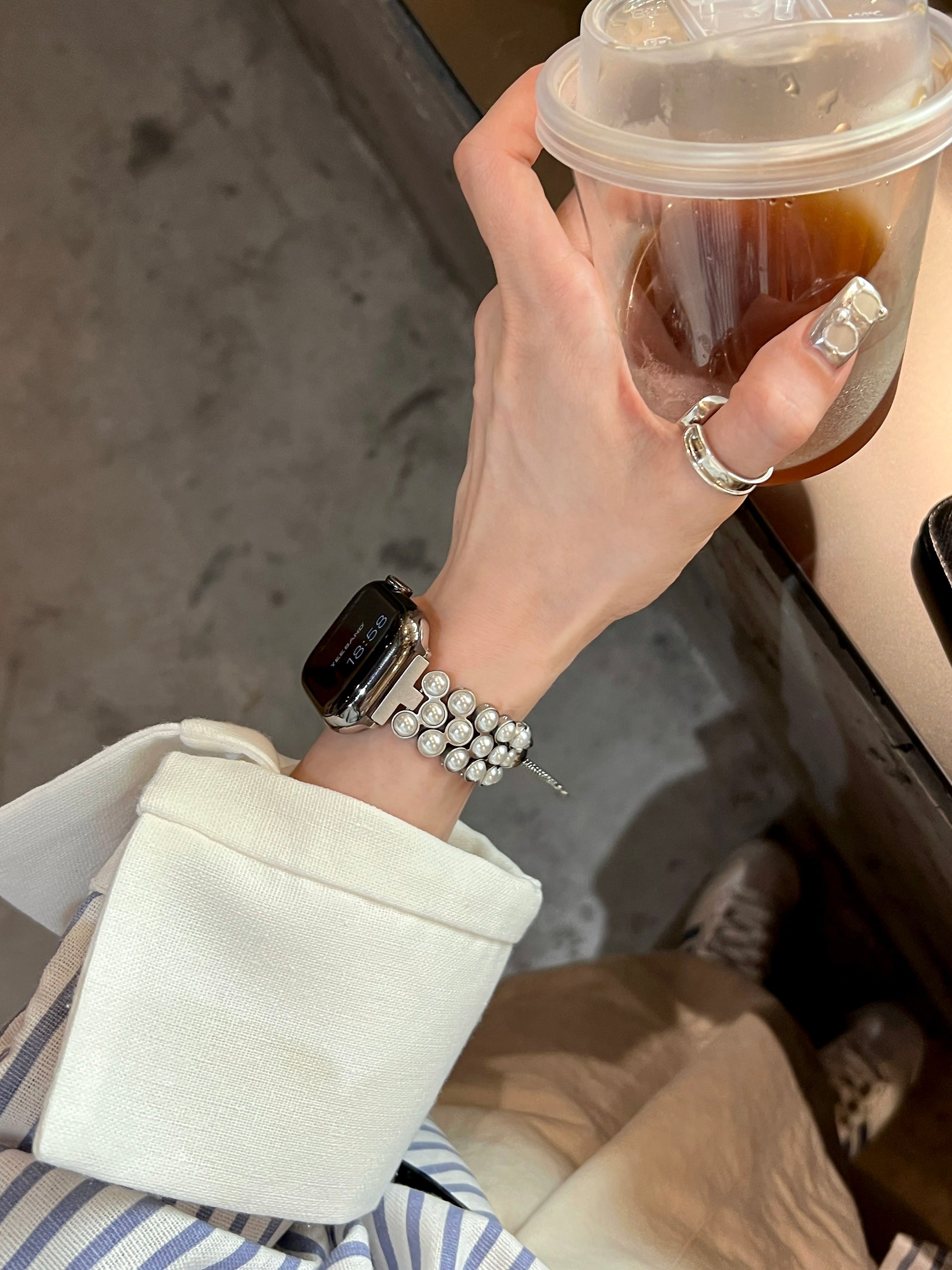 Layered silver-toned metal bracelet with pearl accents, a chic mix of edgy and feminine. Perfect for stacking with your watch band.